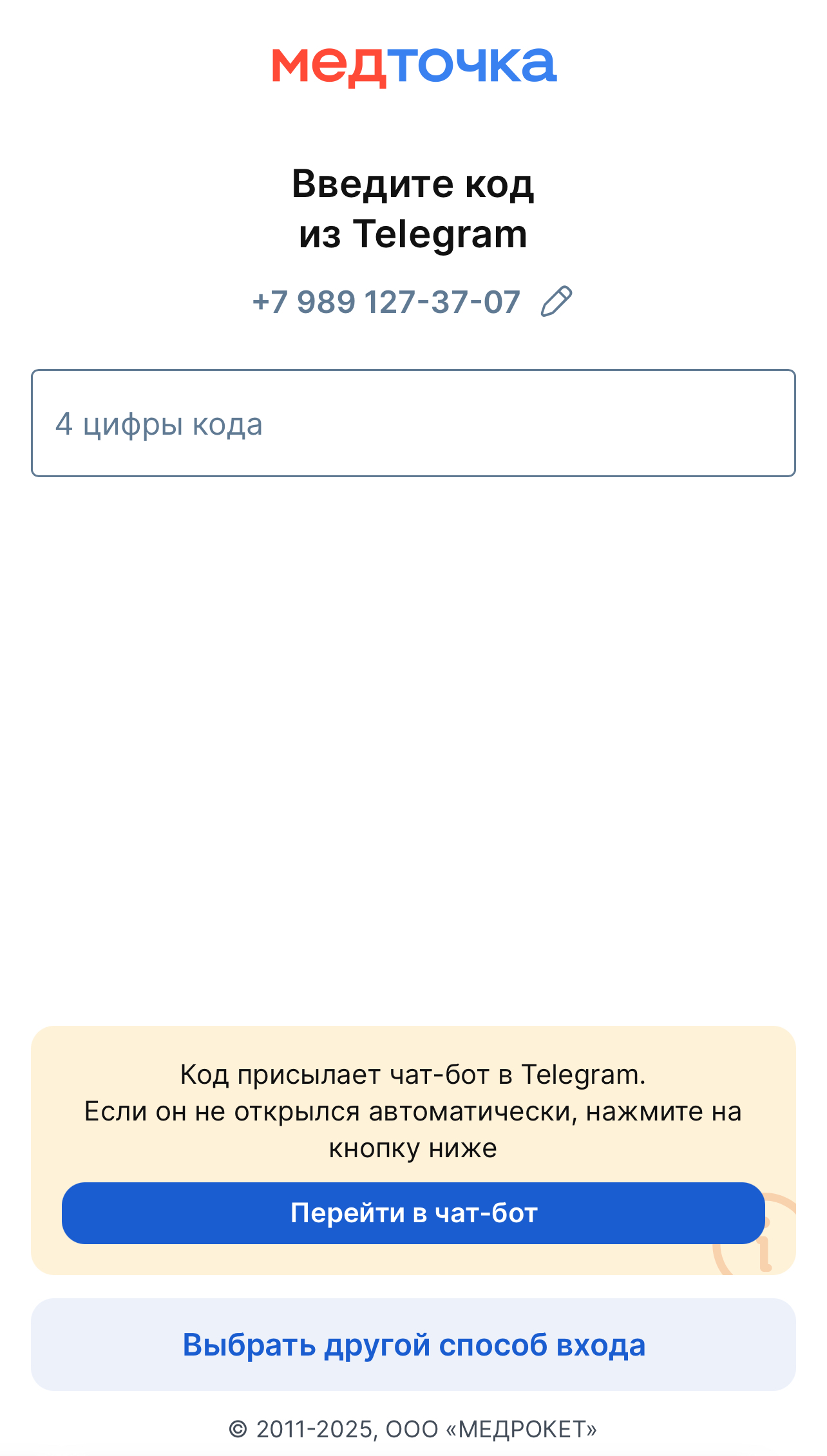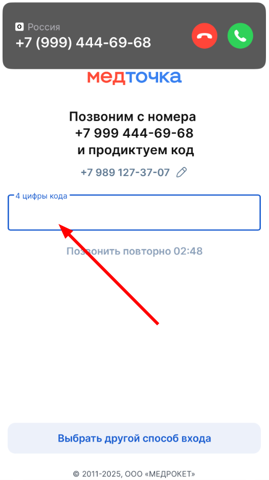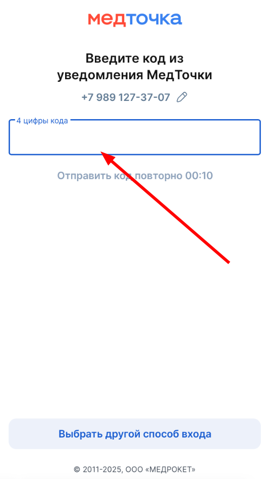 2. Введите код из уведомления от приложения МедТочка.