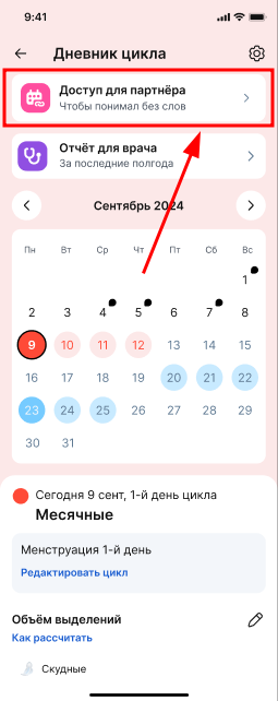 После перехода в календарь вы окажетесь на странице своего личного дневника цикла. Здесь мы добавили новую плашку «Доступ для партнёра». Нажмите на неё, чтобы открыть страницу, где можно управлять доступом и делиться календарём.