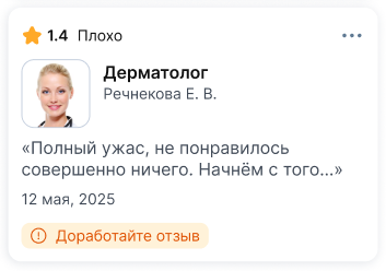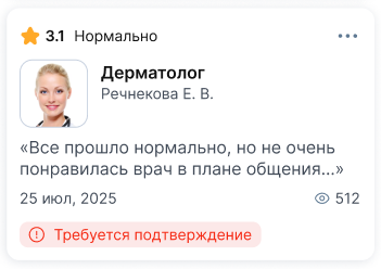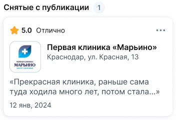 - Отзыв был опубликован, но врач или клиника запросили дополнительную проверку, и вы не смогли подтвердить написанное в отзыве.