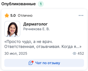 В приложении МедТочка вы можете увидеть все отзывы, которые оставили на врача или клинику. Отзывы могут иметь 4 разных статуса.