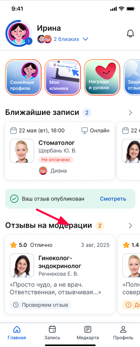 На главной странице в блоке «Отзывы на модерации» отображаются отзывы со статусами «Проверяем отзыв» или «Доработайте отзыв».