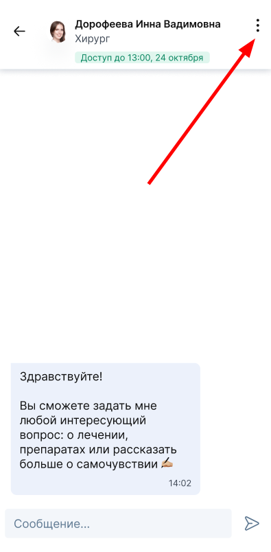 В настройках чата вы можете отключить или включить уведомления от выбранного чата и настроить доступ к медкарте для врача. Для открытия настроек нажмите на три точки.