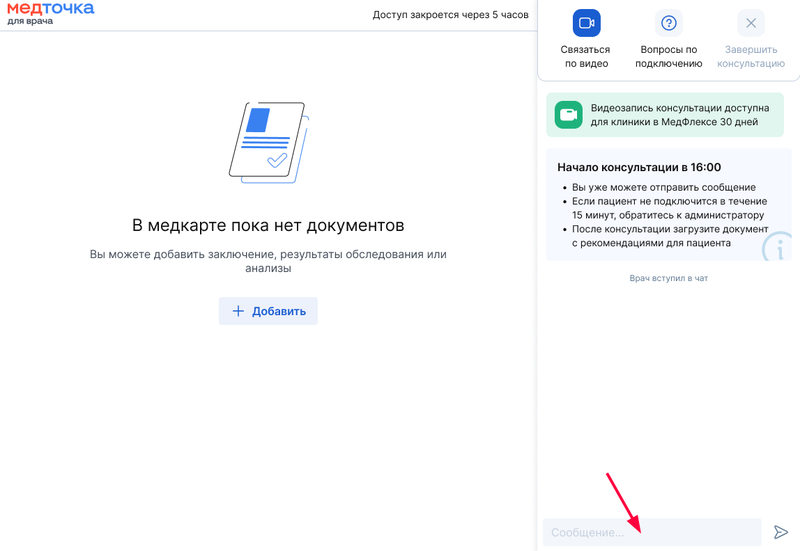 8. Справа расположен чат для переписки с пациентом. Можете написать ему за 5–10 минут, чтобы подтвердить консультацию.