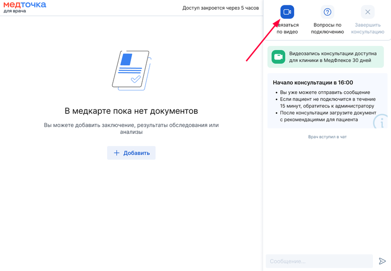 Видео можно свернуть, чтобы параллельно пользоваться медкартой пациента и чатом.