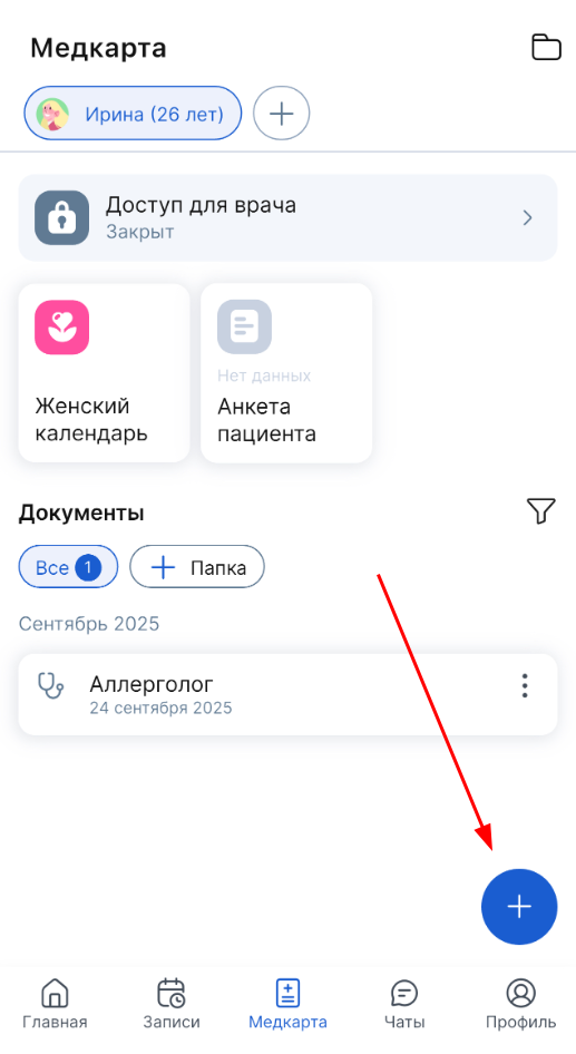 Немесе төменгі панельдегі бөлімге кіріп «Медкарта» , содан кейін дөңгелек түймені басыңыз «+» .