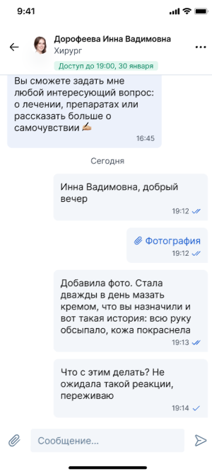 При нажатии на файл в чате, вы и врач увидите загруженные документы и фото.
