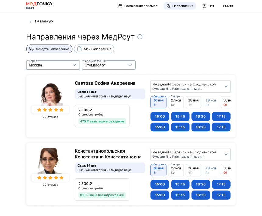 В личном кабинете МедТочка Врач вы можете записать пациента на приём к другому врачу через раздел «Направления» и получить за это вознаграждение.