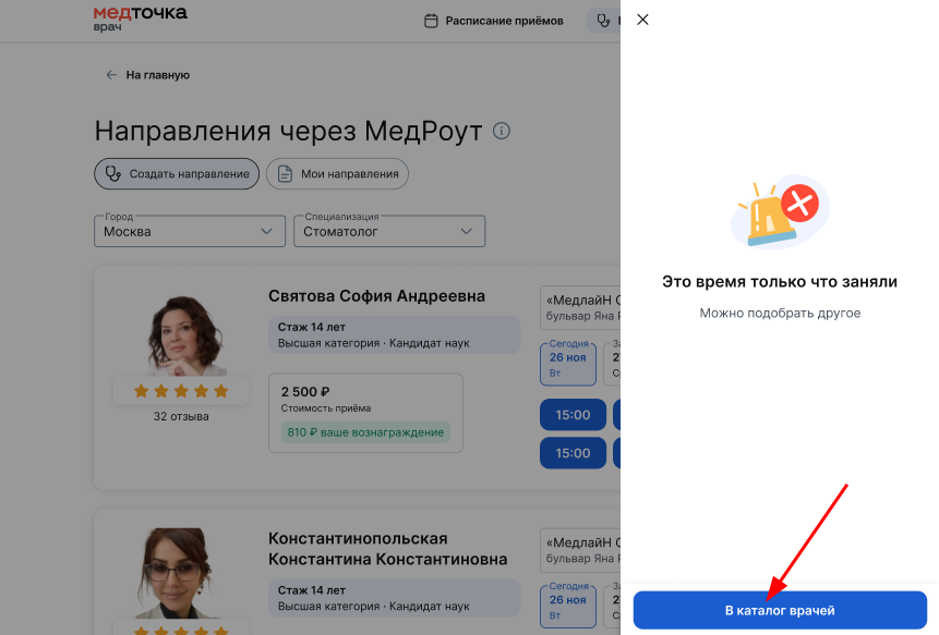 - Пока вы заполняли данные пациента, выбранное вами время приёма заняли. Если пока вы заполняли данные пациента, выбранное вами время стало недоступным, нажмите в появившемся окне «В каталог врачей» и повторно создайте направление на другое свободное время.