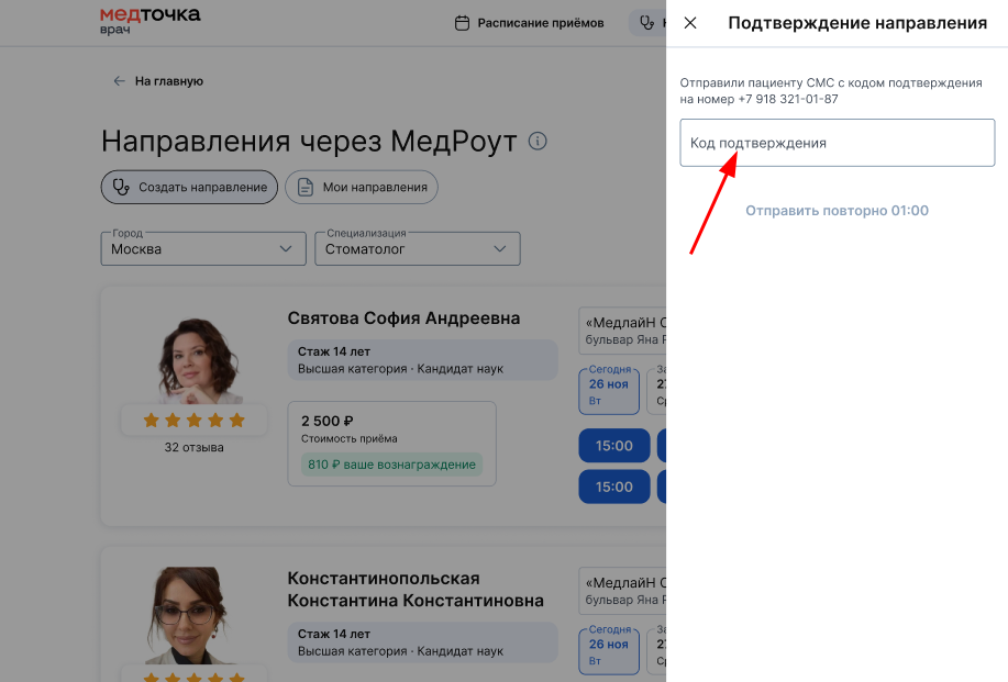 11. Попросите пациента продиктовать вам код, который он получил в СМС. Введите код подтверждения направления в специальное поле на экране.