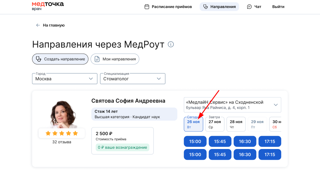 В данном окне вы также можете увидеть стоимость приёма для пациента и размер вознаграждения, которое вы получите за направление.